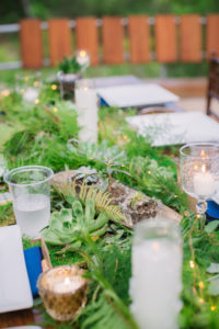 wedding table with ferns succulents candles and fairy lights and blue napkins