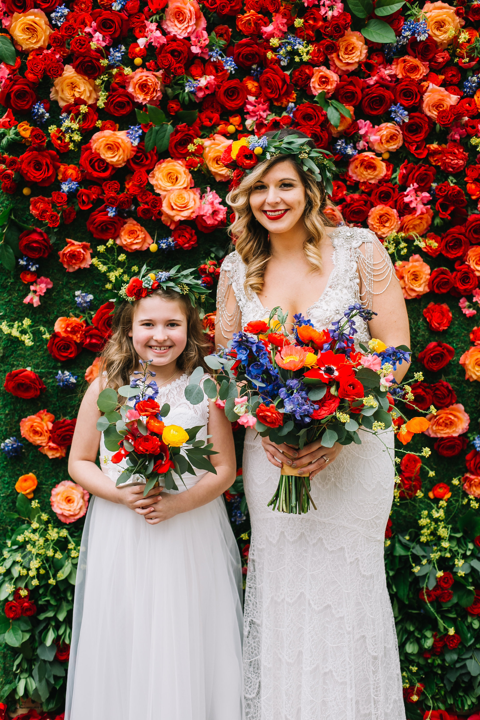 bride and flower girl with head wreaths of bright flowers at austin wedding