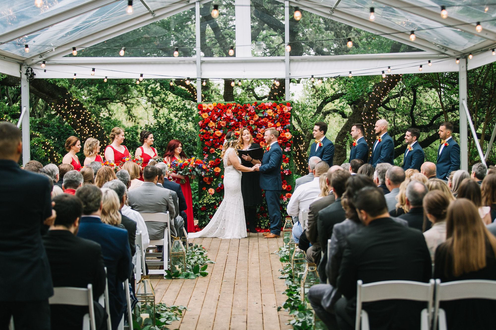 Jewel Tone wedding flowers as ceremony backdrop, red, orange, green, blue